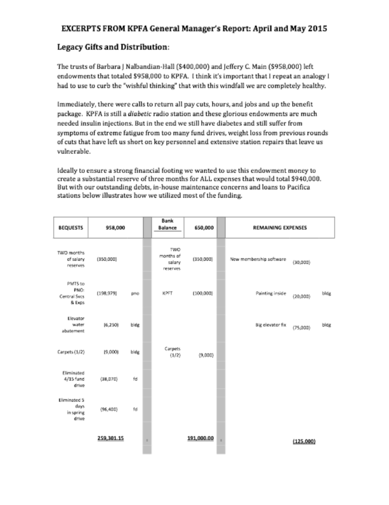 Note that part of the two bequests was being applied as “reserves” (at least to paid staff salaries thus the decision to forego the 2015 Spring fund drive), however it is not clear if the two-month salary reserves have already been exhausted, i.e., are there still any reserves? But since KPFA left itself dependent on the two bequests, it is not known what the financial situation within KPFA currently is or will be once the October 29, 2015 motion passed by the PNB is executed.