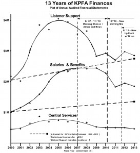 Based on the generous donations during 2003 after Iraq was invaded based on lies about Weapons of Mass Destruction, the entrenched increased the paid staff by 50%, mostly with their friends and allies. The payroll went from 28 to 42 full time equivalents. Many of us in the minority on the LSB constantly suggested that we needed to cut down the payroll. KPFA’s payroll was the largest in Pacifica. Our pleas were ignored despite reduced revenue and lower membership numbers each year until the crisis got very serious and layoffs were necessary. The SaveKPFA folks and their staff allies consistently accused us of being anti-union for wanting to have layoffs if necessary for fiscal responsibility and a balanced budget.
