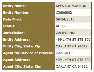 In September 2013, PNB director, former PNB chair/interim Executive Director (iED) Margy Wilkinson registered the above named shadow corporation with the California Secretary of State at the address of Siegel & Yee, the law firm of former PNB director and current Pacifica legal counsel Dan Siegel. They kept this information hidden from the KPFA listeners, the Local Station Board (LSB) and the Pacifica National Board (PNB) until its discovery only recently.