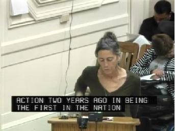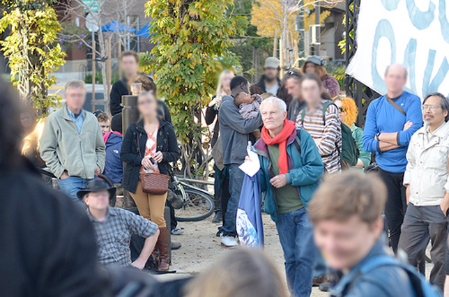 Campaign workers for United for Community Radio at an Occupy Oakland General Assembly. Daniel Borgstrom (leaning forward) and Greg Jan (behind him).
